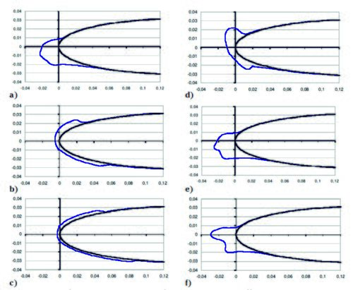 TURBICE simulation results for ice shapes in different air temperatures. The modeled temperatures are a) -27,8ºC b) -19,8ºC c) -13,9ºC d) -6,7ºC e) -3,9ºC f) - 2,8ºC.[1]