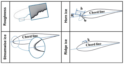 Different conditions (operating and thermodynamic) on the wind turbine blades will result in accreted ice of different densities and shapes. [53] The change in accreted ice shapes affects the air flow behaviour on the blade profile and its aerodynamic performance, [54]. Bragg et al. [56] categorized four types of ice accretion that affect wind turbine blade aerodynamics differently: dispersed roughness, horn ice, streamwise ice and spanwise-ridge ice, as shown in the figure. The change in aerodynamic properties is bigger than the change in the mechanical properties such as change in mass of the rotor, which means that load imbalance of the rotor under icing is mainly due to change in aerodynamic properties. [60]